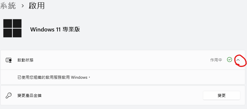第四步 若看到" 已使用您組織的啟用服務啟用Windows ",表示此台電腦的 Windows 11 已經啟用成功